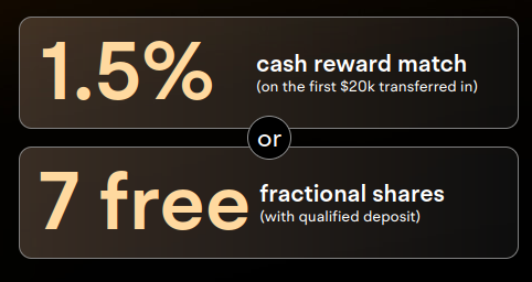 1. The match amount is limited to the first $20,000 transferred in. Additionally, the match only applies to the first ACAT transfer in. Any subsequent transfers are not included. Each of the 7 fractional shares were initially worth $5, totaling $35, based on the closing price on 03/14/2024. The actual value received will vary based on market conditions. The rewards are mutually exclusive. Additional offer terms and conditions apply. View Welcome Bonus Disclosure for more details.